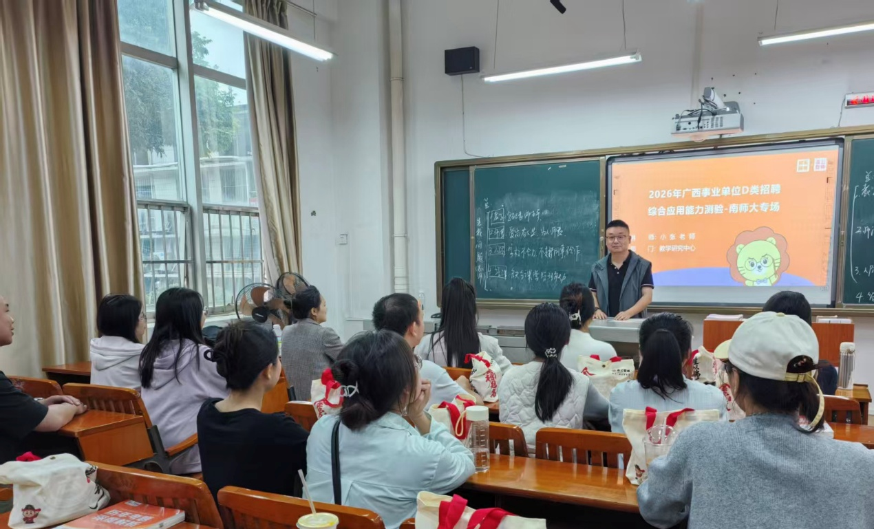 为深入推进毕业生就业指导服务工作,切实提升我校学生事业单位编制考试应试能力,助力高质量就业,3月25日至26日,由学校学生就业中心主办、初等教育学院承办的2026年事业单位D类考试考前冲刺课在明秀校区文星楼109室顺利开讲。本次培训特邀张旭年、李伟军两位资深讲师,吸引众多已报考及有意向报考的学子到场学习。