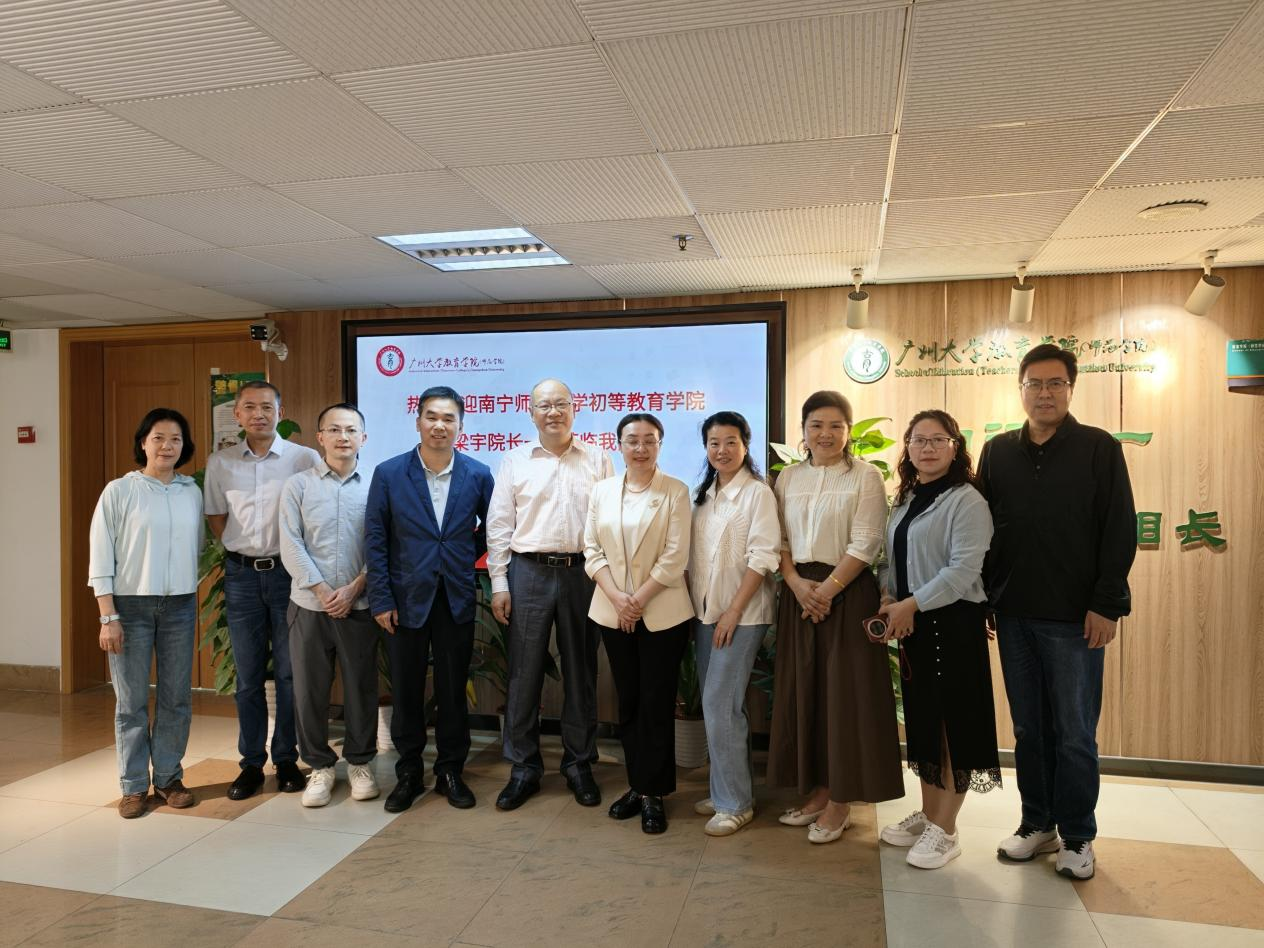 为贯彻落实学校“攀高峰、强特色、创双优,促进学校特色内涵发展”的教育思想大讨论精神,探索“十五五”期间小学教育专业建设与区域教育发展的适配性路径,推动教育链、人才链与创新链深度融合,增强初等教育学院服务广西基础教育发展的专业贡献力、人才支撑力与社会影响力,2026年3月29—31日,初等教育学院梁宇院长一行7人赴粤港澳大湾区教育高地——广州市,对华南师范大学教育科学学院与广州大学教育学院的小学教育专业进行深度调研。通过座谈交流、资料研读、课堂观摩、实验室观摩等形式,重点学习其在人才培养模式创新、课程体系改革、实践教学体系构建、教育科研转化等方面的先进理念与成功经验。